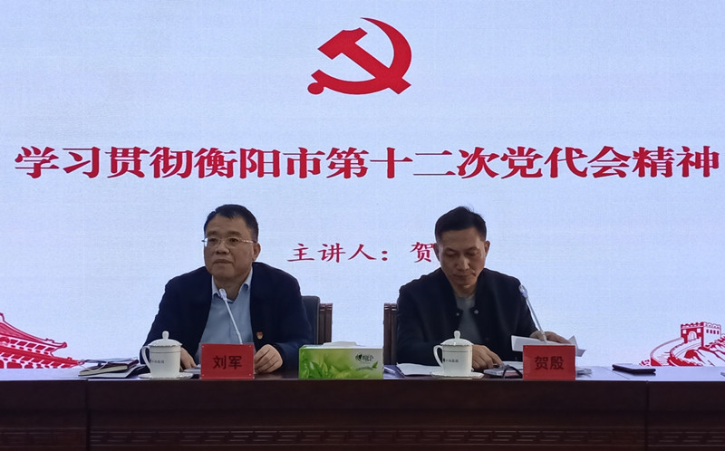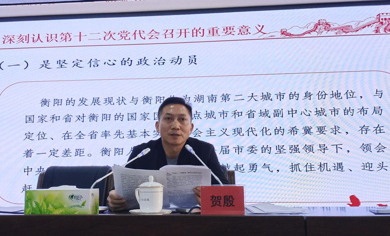 市第十二次黨代會(huì)(本文簡(jiǎn)稱黨代會(huì))是在習(xí)近平總書記考察湖南一周年之際、“兩個(gè)一百年”奮斗目標(biāo)歷史交匯關(guān)鍵節(jié)點(diǎn)、全面建成社會(huì)主義現(xiàn)代化國(guó)家開局之年召開的一次十分重要的大會(huì)。按照市委、市政府工作部署,為深刻領(lǐng)會(huì)貫徹黨代會(huì)精神,弘湘國(guó)投組織召開了專題宣講會(huì),為全體干部職工在以后的工作中提供思想和行動(dòng)指引。由市委宣講團(tuán)成員、市委黨校(衡陽行政學(xué)院)常務(wù)副校(院)長(zhǎng)賀殷宣講,弘湘國(guó)投黨委書記、董事長(zhǎng)劉軍主持。