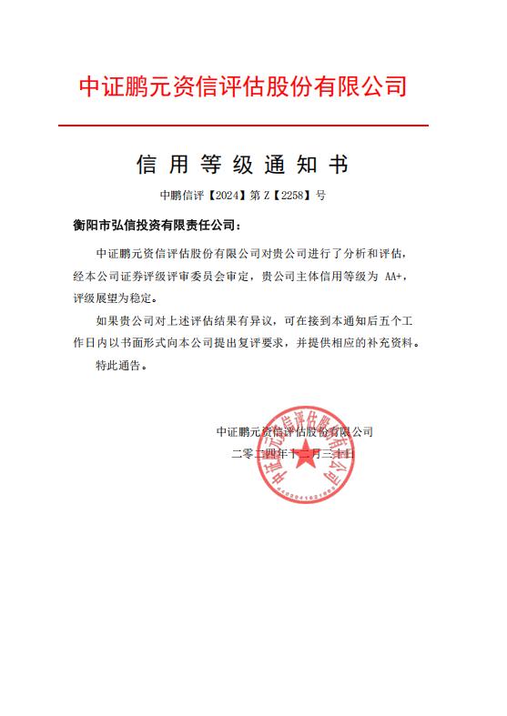 12月31日,衡陽市國有資產(chǎn)投資控股集團(tuán)有限公司子公司衡陽市弘信投資有限責(zé)任公司,被國內(nèi)權(quán)威信用評(píng)級(jí)機(jī)構(gòu)中證鵬元資信評(píng)估股份有限公司認(rèn)定主體長期信用等級(jí)為 AA+,評(píng)級(jí)展望為穩(wěn)定。
